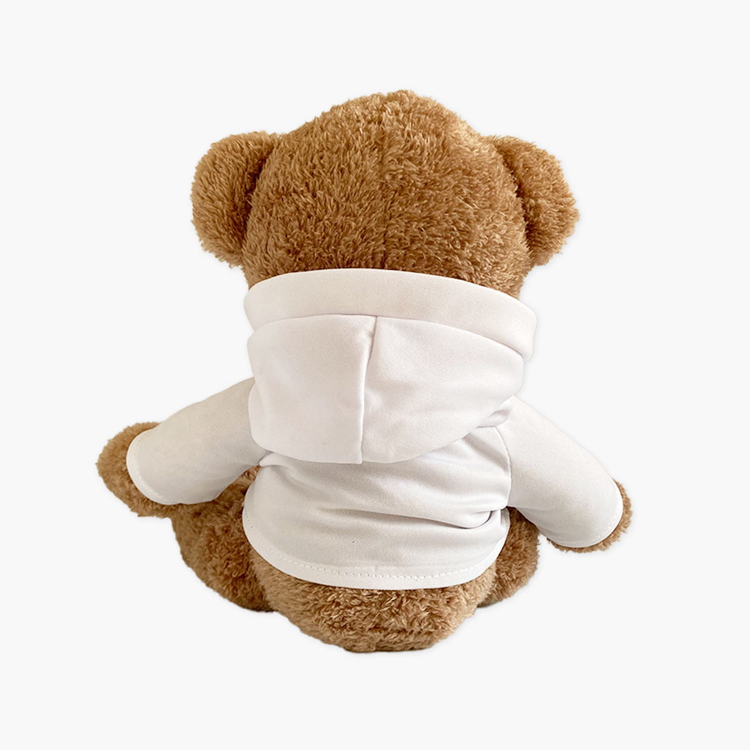 Osito de peluche que viste una sudadera blanca con capucha con el logo de la UOC.
